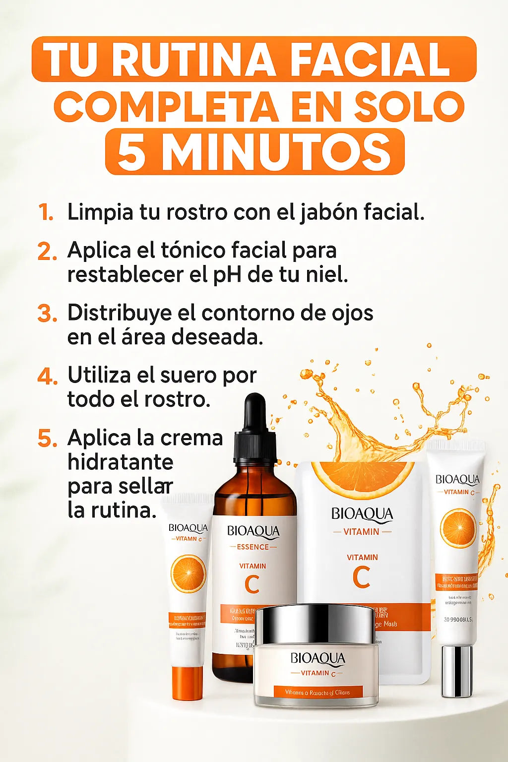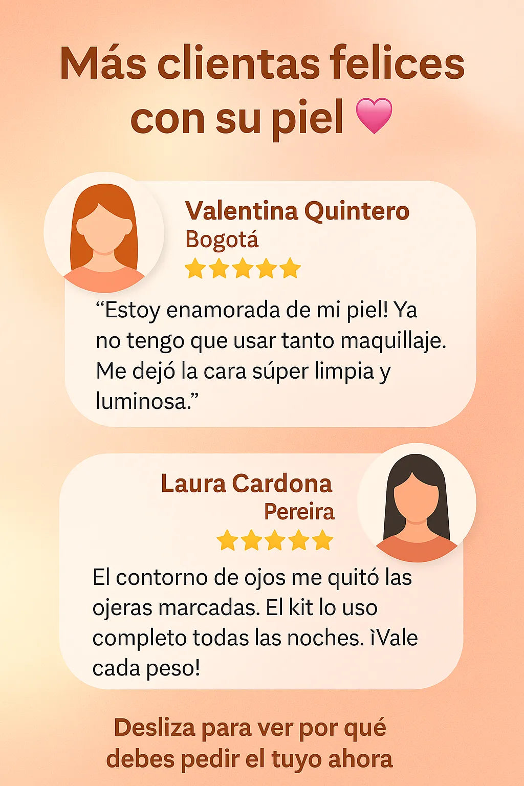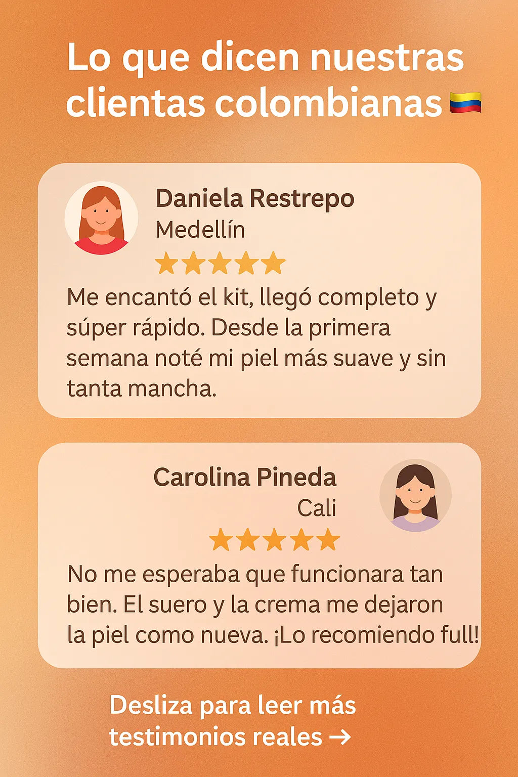 Desde que uso este kit, mi piel cambió por completo. Tenía manchas en los pómulos y opacidad en la frente, pero ahora se ve uniforme y luminosa. Además, la tienda me atendió súper rápido y me llegó el pedido al otro día. ¡Excelente todo!